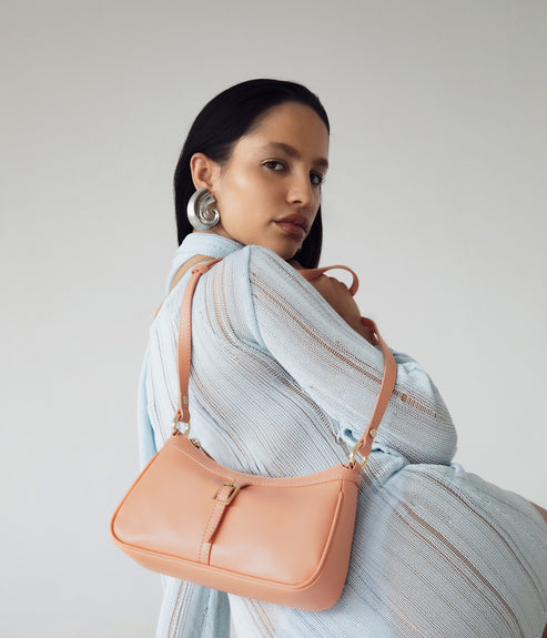 Sac à bandoulière avec bretelle ajustable avec une fermeture à glissière sur le dessus et un détail de boucle sur le devant.